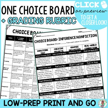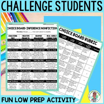 Looking for a creative way to build inference skills in your students? This Choice Board Nonfiction Inference resource is packed with engaging activities that make learning inference strategies more interactive and fun. Designed to promote higher-order thinking, this tool helps students practice inferring meaning from nonfiction texts in a structured, student-centered format. Perfect for differentiated instruction, small group activities, or independent work!