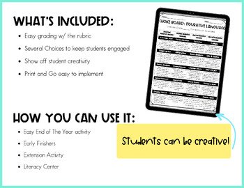 Elevate your reading instruction with our 4th Grade Figurative Language Choice Board! Designed to enhance student engagement and foster a love for reading, this choice board offers a variety of fun, interactive activities that cater to diverse learning styles. Ideal for end-of-year activities, independent work, or literacy centers, this resource helps combat boredom and keeps students motivated.